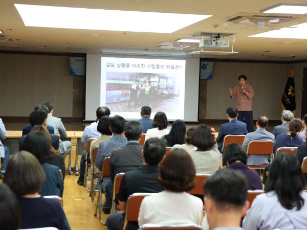 국민권익위원회 청렴연수원 정승호 전문강사는 류규하 중구청장, 김오성 중구의회 의장 등 고위공직자와 6급 이상 직원을 대상으로 ‘직무권한 등을 행사한 부당행위 등 공공기관의 불공정 갑질 관행 근절 방안’에 대해 강의하며, 직장에서 빈번히 발생할 수 있는 괴롭힘에 대한 구체적인 사례를 들어가며 갑질 예방과 조직문화 개선은 고위공직자의 배려와 소통의 자세가 가장 중요하다고 강조했다.