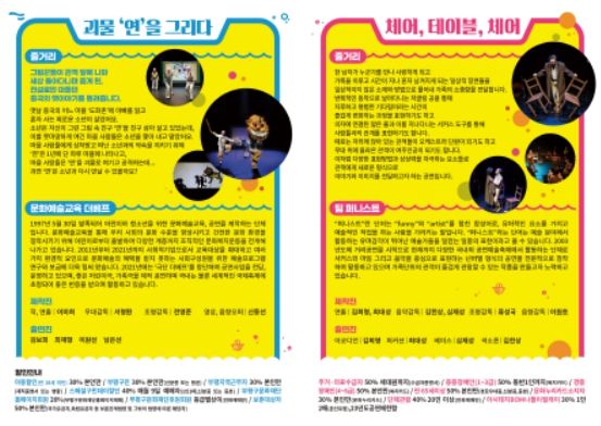 음악극 '체어, 테이블, 체어'는 다음달 22~23일 오전 11시 해누리 극장에서 무대에 오른다. 만 7세 이상이 관람할 수 있다. 어린이극 '괴물‘연’을 그리다'는 다음달 24일 오전 11시와 오후 3시 달누리 극장에서 펼쳐진다. 만 5세 이상 관람 가능하다.