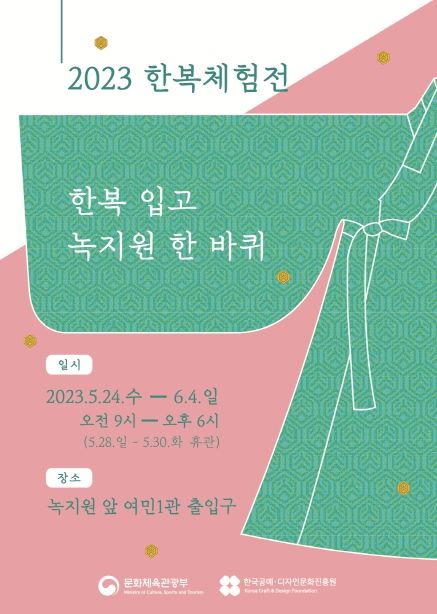 문화체육관광부는 한국공예·디자인문화진흥원과 함께 청와대에서 5월 24일부터 6월 4일까지 전통한복을 체험할 수 있는 ‘한복 입고 녹지원 한바퀴’ 행사를 개최한다.