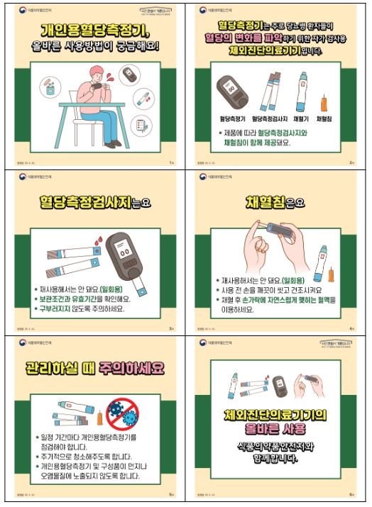 참고로 개인용혈당측정기의 올바른 사용 방법을 쉽게 알 수 있도록 ‘개인용혈당측정기, 올바른 사용 방법이 궁금해요!’ 제목의 카드뉴스를 배포했으며, ‘식약처 누리집 ' 법령/자료 ' 홍보물 자료 ' 카드뉴스’에서 확인할 수 있다.