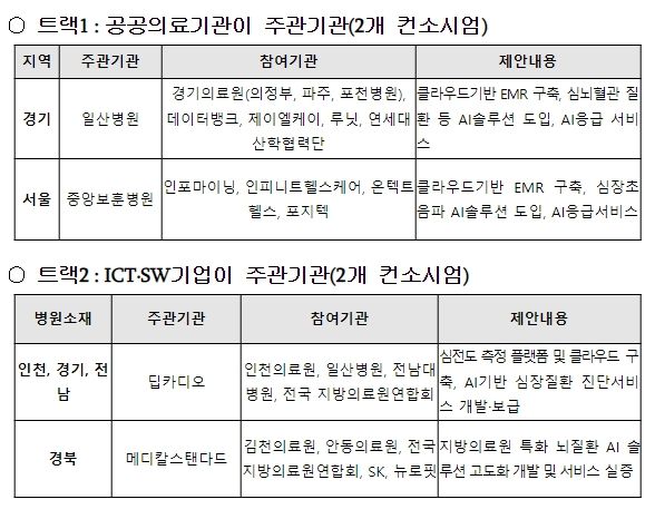 첫 번째, 일산병원 컨소시엄은 경기도 서북부 지역 주민(약 217만명)의 절반 이상이 고양시로 원정 진료를 받는 현실을 극복하기 위해 일산병원과 의정부병원, 파주병원, 포천병원 등 서북부 지역을 연결하는 인공지능 기반 응급의료 네트워크(AI 핫라인)를 운영할 계획이다. AI 핫라인은 심뇌혈관 의료AI 소프트웨어로 응급환자의 영상 분석 및 예측, 병원 간 응급환자 정보 공유를 통해 지역 응급의료 체계를 개선할 계획이다.