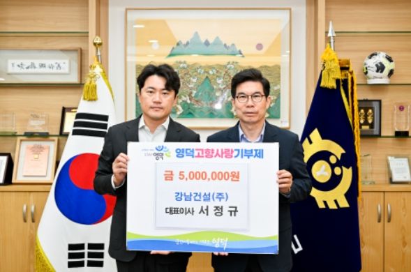 [제주교통복지신문 김강석 기자] 부산광역시 사하구에 있는 강남건설(주)의 서정규 대표가 지난 18일 영덕군에서 김광열 영덕군수을 만나 고향사랑기부금 500만원을 기탁했다.