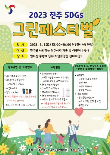 [제주교통복지신문 김강석 기자] 진주시지속가능발전협의회(회장 민현주)가 6월 3일 오후 1시 월아산 숲속의 진주 자연휴양림 잔디마당에서 ‘2023 진주 SDGs(지속가능발전목표) 그린 페스티벌’을 개최한다.