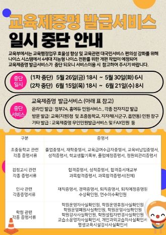 정부 24, 홈에듀민원서비스 등 온라인 발급서비스 뿐만 아니라, 방문민원과 팩스민원 발급 등도 모두 중단되어 해당기간 제증명 관련 서류가 필요하면 사전에 미리 챙겨야 한다.