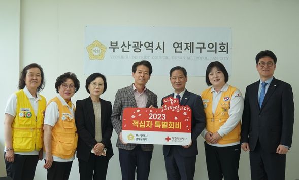 이날 전달식에는 대한적십자사 부산지사 권용규 사무처장, 대한적십자사봉사회 연제구지구협의회 김은위 회장 등 관계자 6명이 참석했으며, 연제구의회를 대표해 최홍찬 의장이‘2023년 적십자 특별회비’를 전달했다.