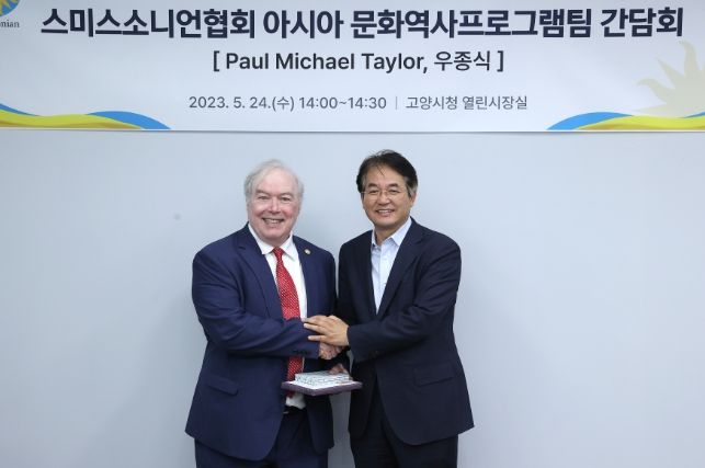 [제주교통복지신문 김강석 기자] 이동환 고양특례시장이 5월 24일 고양시청에서 스미스소니언재단(Smithsonian Institution)의 폴 마이클 테일러(Paul Michael Taylor) 국장과 우종식 컨트리뷰터 등 아시아 문화역사프로그램팀 관계자, EBS미디어 박성호 대표와 간담회를 가졌다.