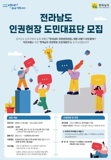인권헌장 제정에 관심 있는 도민이면 누구나 신청서를 작성해 우편이나 이메일로 6월 2일까지 전남도에 제출하면 된다. 자세한 내용은 도 대표 누리집 공고란에서 확인할 수 있다.