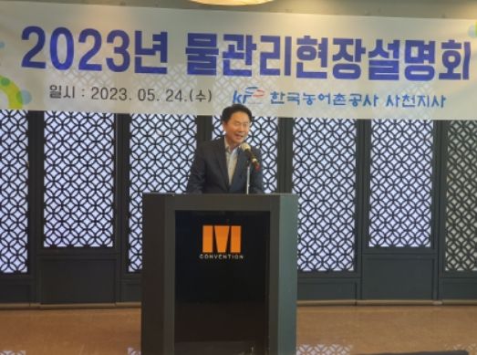 [제주교통복지신문 김강석 기자] 한국농어촌공사 사천지사는 24일 엠컨베션웨딩뷔페홀에서 박동식 사천시장을 비롯한 임철규 경상남도 도의원, 윤형근 사천시의회 의장 및 시의원, 사천시 농업인, 운영대의원, 수리시설감시원 등 150여명이 참석한 가운데 2023년 물관리 현장설명회”를 실시했다.