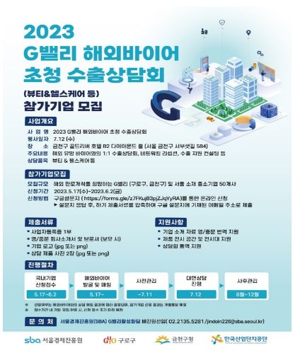 수출상담회 국내기업 모집은 6월 2일까지다. 뷰티, 건강관리(헬스케어) 분야의 G밸리 및 서울시 소재 기업 중 참가하고자 하는 기업은 서울경제진흥원 누리집에 접속 후 ‘2023 G밸리 해외바이어 초청 수출상담회 참가기업 모집’에서 신청할 수 있다.