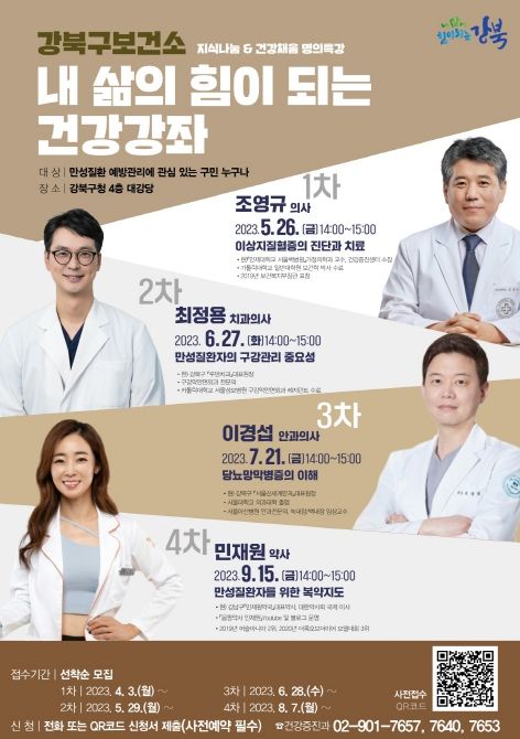 이순희 강북구청장은 “많은 분들이 강좌에 참석하셔서 전문가들로부터 건강관리에 관한 실용적인 조언을 얻어가길 바란다”며 “강북구는 앞으로도 구민의 질환예방과 삶의 질 향상을 위한 건강 프로그램을 도입하는데 힘쓰겠다.”고 강조했다.
