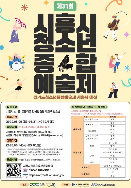 [제주교통복지신문 김강석 기자] 시흥시와 경기도가 주최하고, (재)시흥시청소년재단 정왕청소년문화의집이 주관하는 ‘제31회 시흥시청소년종합예술제’에 참여할 청소년을 5월 31일까지 모집한다.