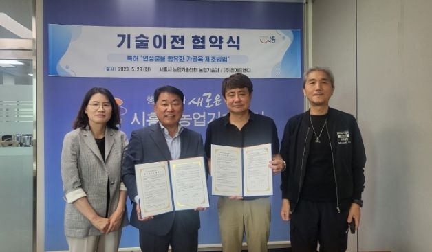 [제주교통복지신문 김강석 기자] 시흥시농업기술센터가 지난 23일 자체적으로 개발한 농산물을 활용한 고부가가치 가공기술인 ‘연 성분이 함유된 가공육 제조방법, 특허 제10-2091253호’에 대해 ㈜진에프엔디와 기술이전 협약을 체결했다.