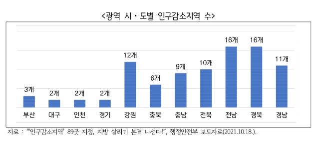 감사원이 국내 저출산 문제를 분석하기 위해 2021년 7월 발간한 ‘인구구조 변화 대응 실태 감사보고서’에서는 2067년 화성시를 제외한 30개 시군을 소멸 고위험 지역(65살 고령인구가 20~30대 여성인구의 다섯 배가 넘는 곳)으로 분류했다. 현재 도내 소멸위험 지역(65살 고령인구가 20~30대 여성인구의 두 배가 넘는 곳)은 가평, 연천, 양평, 여주, 포천, 동두천 등 6곳이다.