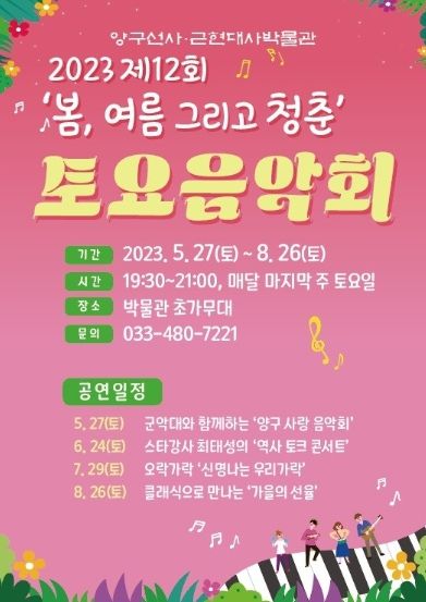 [제주교통복지신문 김강석 기자] 양구군은 오는 27일부터 양구 선사·근현대사박물관 야외 초가무대에서 '제12회 ‘봄, 여름 그리고 청춘’ 토요음악회'를 개최한다.