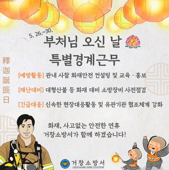 [제주교통복지신문 김강석 기자] 거창소방서는 부처님 오신 날을 맞아 오는 26일부터 30일까지 특별경계근무 태세에 돌입한다고 밝혔다.