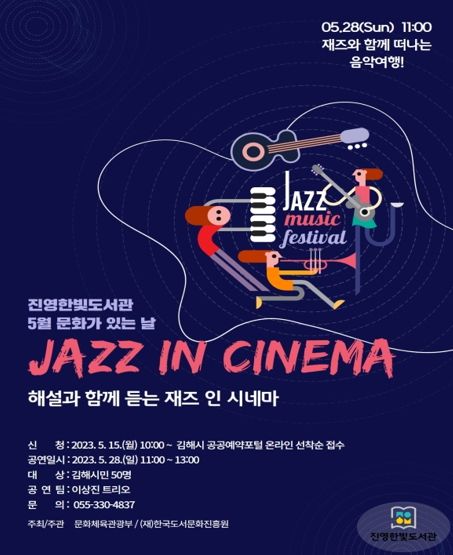 5월 문화가 있는 날을 맞아 진행하는 ‘해설과 함께 듣는 재즈 인 시네마’는 오는 28일 오전 11시부터 오후 1시까지 도서관 다목적홀에서 2시간가량 진행된다. 이날 베이시스트 이상진, 재즈피아니스트 윤성희, 보컬 하이진으로 이루어진 재즈 공연팀 ‘이상진 트리오’는 영화 속의 명곡들을 재즈 스타일로 연주하고 인문학적 해설까지 곁들인다.