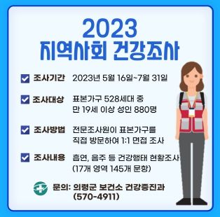 [제주교통복지신문 김강석 기자] 의령군은 주민 맞춤형 건강정책 수립을 위한 2023년 지역사회건강조사를 실시한다.