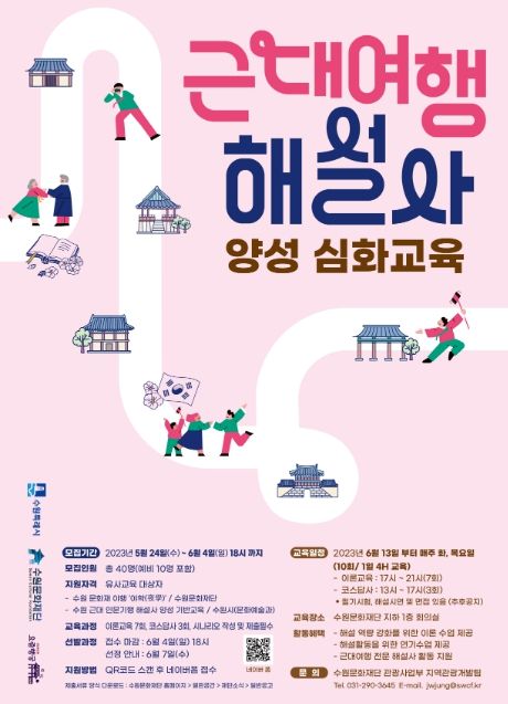 [제주교통복지신문 김강석 기자] 수원문화재단은 문화체육관광부 공모사업으로 선정된 '계획공모형 지역관광개발사업'의 일환으로 진행하는 '근대여행 해설사 양성 심화 교육 과정' 교육생을 모집한다.