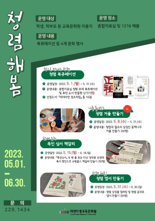 [제주교통복지신문 김강석 기자] 대전시교육청 대전학생교육문화원은 대전지역 학생 및 학부모를 대상으로 청렴 정책을 홍보하고 청렴 인식 제고와 문화 공유를 위해 오는 6월 말까지 청렴을 주제로 한 ‘청렴 해봄’ 행사를 운영한다고 밝혔다.