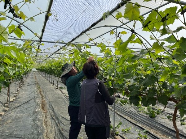 감문면 행정복지센터 직원 9명은 이른 아침부터 모여 농장주에 포도 순 따는 방법을 간략히 배운 후 서툰 솜씨이지만 농가에 도움이 되고자 하는 마음으로 작업에 몰두했다.