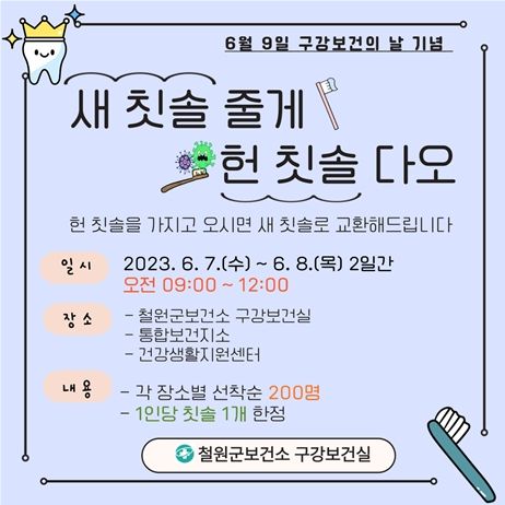 제78회 구강보건의 날을 맞이하여 철원군보건소에서는 6월 7일부터 8일까지(오전 9시부터 12시) 보건소 구강보건실, 통합보건지소, 건강생활지원센터 3개소에서 각 장소별 선착순 200명에게 1인당 칫솔 1개에 한정하여 헌 칫솔을 새 칫솔로 교환 해주는 ‘새 칫솔 줄게, 헌 칫솔 다오’ 행사를 진행한다.