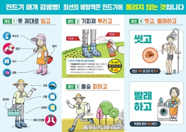 따라서 보건소 관계자는 농·작업, 임산물 채취, 등산 등 야외활동 전 ▲안전하게 옷 갖춰 입기(밝은색 긴 소매, 긴 바지, 모자, 목수건, 목이 긴 양말, 장갑 등) ▲진드기 기피제 사용하기 ▲활동 후 물린 부위 없는지 꼼꼼히 살피기 ▲목욕 및 세탁 철저 등의 예방수칙을 준수 할 것을 당부했다.