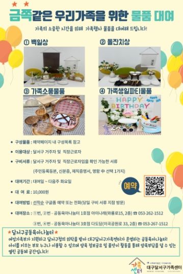 원준호 달서구가족센터 관장은 “가족의 기념일을 함께 함으로써 가족이 소중한 시간을 보내는데 해당 대여사업이 많은 도움이 되길 바란다. 대여사업뿐만 아니라 달서구 공동육아나눔터 이용을 통해 지역사회 내 품앗이 활동으로 공동육아 인식이 강화되어 부모의 양육부담이 감소되길 바란다.”라고 말했다.