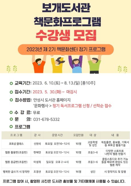 [제주교통복지신문 김강석 기자] 안성시 보개도서관 내 책문화센터에서는 오는 5월 30일부터 2023년 제2기 정기 프로그램 수강생을 선착순 모집한다. 이번 2기 프로그램은 6월 10일부터 8월 13일까지 총10주간 운영하며, 4개 강좌에 총46명을 모집한다.