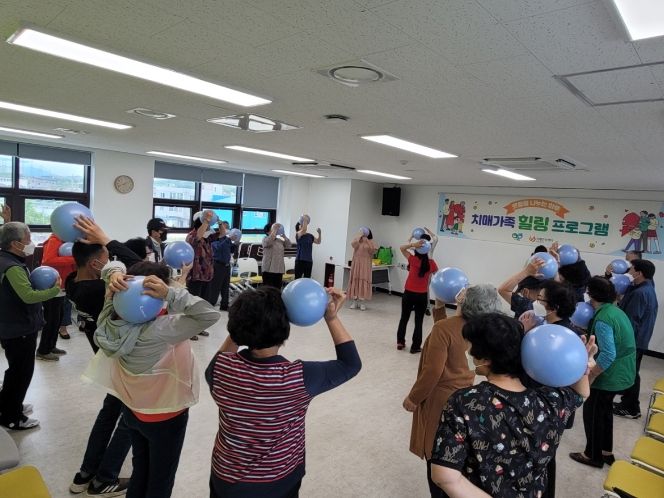 이번 프로그램은 2회로 운영되며 짐볼을 이용해 신체와 손의 협응력을 강화하는 건강체조와 단체 게임으로 단어를 몸으로 표현하기, 발 볼링 등 신체를 활용한 동작으로 구성됐으며 치매환자와 가족이 함께 게임을 하는 과정을 통해 자연스럽게 스트레스를 해소하고 웃음을 유발함으로써 기분전환이 되는 시간을 제공했다.