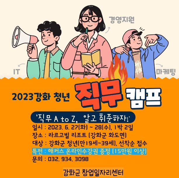 [제주교통복지신문 김강석 기자] 강화군 창업일자리센터에서는 2023년 채용 트렌드 및 직무중심 채용에 따른 직무역량 강화를 위해 ‘청년 직무 캠프’에 참여할 청년을 모집한다.