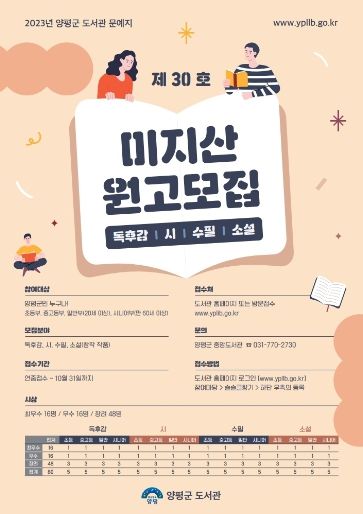 [제주교통복지신문 김강석 기자] 양평군은 군민들의 순수 문예 창작활동 작품집인'미지산'을 발간해 지역 문화·예술의 생활화 및 독서문화 조성을 위해 오는 10월 31일까지 원고를 모집한다고 밝혔다.