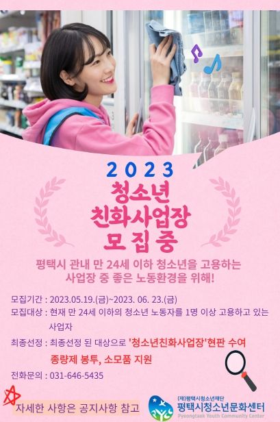 ‘청소년 친화 사업장’은 평택시청소년문화센터에서 처음으로 시작하는 청소년 노동 인권 보호 관련 사업으로, 평택시 청소년 노동자들을 위한 우수 노동환경을 제공하고 있는 사업장을 발굴하여 지원 및 홍보하기 위한 사업이다. 모집 기간은 오는 6월 23일(금)까지며 평택시 관내 만 24세 이하 청소년을 고용하고 있는 사업장이라면 신청할 수 있다.