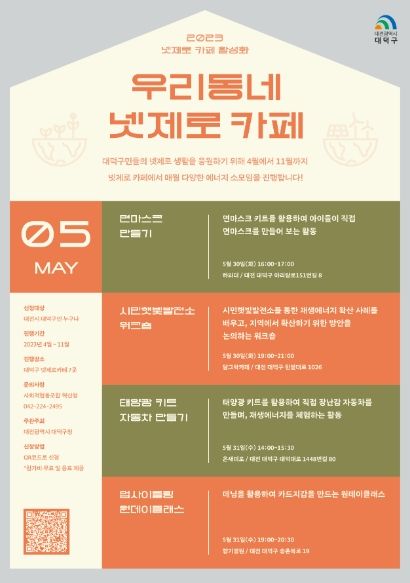 25일 대덕구에 따르면 에너지 소모임은 오는 11월까지 ‘2023년 넷제로카페 활성화 사업’의 일환으로 진행되며, 이번 5월은 △시민햇빛발전소 워크숍(오정동 달그락:한밭대로 1026) △태양광 키트 자동차 만들기(목상동 온새미로:대덕대로1448번길 80) △업사이클링 원데이클래스(중리동 향기정원:송촌북로 19) △면마스크 만들기(회덕동 하와더:아리랑로151번길 8) 등 다양한 활동을 진행한다.