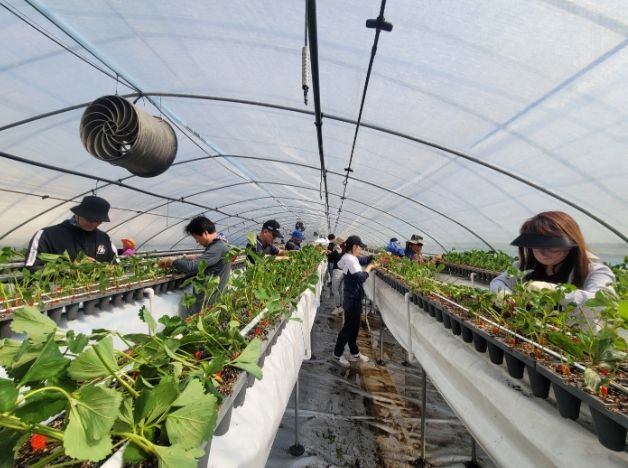 이날, 건축디자인과 직원들은 딸기모 제거와 정리 등 농가의 부족한 일손을 돕기 위해 구슬땀을 흘리고, 농가에서 판매하는 농산물도 구입했다.