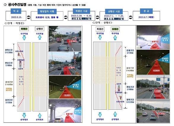 이번 공사는 올해 5월 30일(화)부터 7월 30일(일)까지 62일 기간 중 하행선(국우터널→산격대교 방면) 17일, 상행선(산격대교→국우터널 방면) 17일간 순차적으로 편도 2차로 중 1개 차로를 부분 통제할 예정이다.