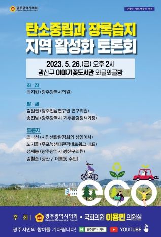 [제주교통복지신문 김강석 기자] 광주광역시의회와 이용빈 국회의원실이 공동 주관하여 5월 26일 오후 2시 광산구 이야기꽃도서관 와글와글방에서 ‘탄소중립과 장록습지, 지역활성화’를 주제로 토론회를 개최한다.