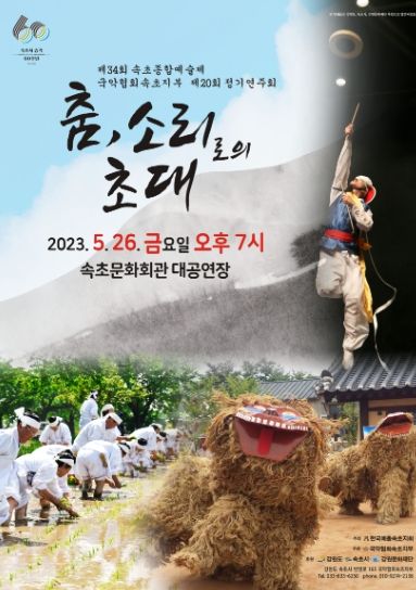 특히, 5월 26일 오후 7시 속초문화예술회관에서는 개막식과 더불어 속초도문농요, 돈돌라리, 속초사자놀이, 민요 등 다양한 공연으로 구성된 국악협회속초지부의 제20회 정기연주회가 종합예술제의 시작을 알린다.