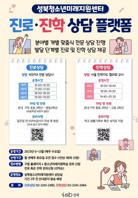 [제주교통복지신문 김강석 기자] 성북구가 6월 7일부터 관내 초중고 학생 및 학부모를 위한 ‘1:1 맞춤형 진로•진학 상담 플랫폼’을 올해 연말까지 상시 운영한다.