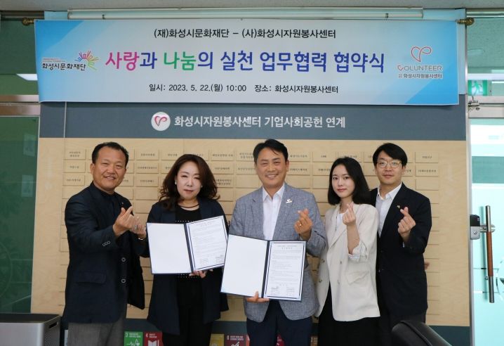 [제주교통복지신문 김강석 기자] (재)화성시문화재단은 지난 5월 22일(월) (사)화성시자원봉사센터와 ESG(Environment, Social and Governance) 관점에서의 전략적 사회공헌활동 활성화를 위한 업무협약(MOU)을 체결했다. 오후 3시부터 화성시자원봉사센터 이사장실에서 진행된 이번 협약에는 김신아 화성시문화재단 대표이사, 윤효석 화성시자원봉사센터 이사장 및 양 기관 관계자들이 참석했다.