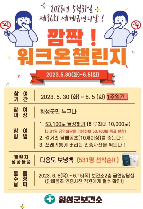 추가로 5월 30일부터 6월 5일까지 1주일간 모바일 워크온 앱을 활용한 워크온 챌린지 참가자들을 대상으로 횡성 관내 지역 내 곳곳을 걸으며 53,100보 이상 걷고 길거리에 버려진 담배꽁초 10개 이상을 주워 쓰레기통에 버리는 인증을 하면 챌린지 성공 물품을 증정하는 행사를 진행해 다각적으로 금연의 날 관련 홍보를 진행할 예정이다.