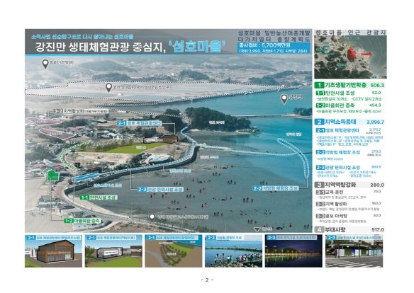‘섬호권역 다(多)가치 일터 조성사업’은 2024년부터 5년간 ‘강진만 생태체험 관광 중심지, 섬호마을’이라는 비전으로 추진될 계획이다. 강진만 갯벌의 생산물과 체험을 활용한 소득사업 선순환구조로 ‘다시 살아나는 마을’ 기반을 구축할 예정이다.