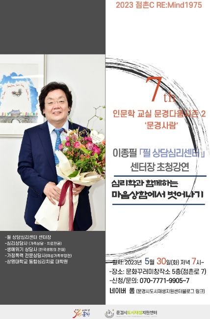 [제주교통복지신문 김강석 기자] 문경시도시재생지원센터는 5월 30일(화) 저녁 7시 문화꾸러미창작소 5층에서 이종필 필상담심리센터장을 모시고 ‘심리학과 함께하는 마음상함에서 벗어나기’라는 주제로 23년도 인문학교실 문경다움 시즌2, 1학기 마지막 초청강연을 진행한다.