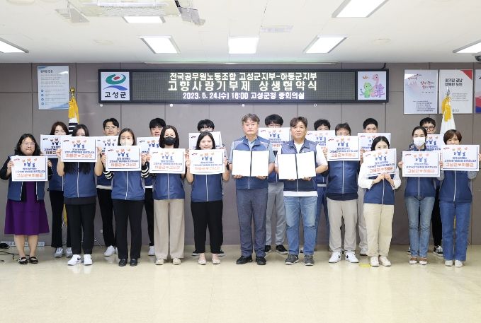 [제주교통복지신문 김강석 기자] 전국공무원노동조합 하동군지부는 24일 고성군청 중회의실에서 고성군지부와 고향사랑기부제 상생 협약식을 열었다고 26일 밝혔다.