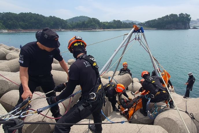 주요 훈련 내용은 ▲ 네발 방파석 나사연결뭉치 설치방법 숙달 ▲ 다목적삼각대를 활용한 인명구조 ▲ V-strap을 활용한 인명구조 ▲ 구조 대상자 외상응급처치 등이다.