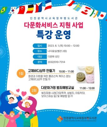 [제주교통복지신문 김강석 기자] 인천광역시교육청부평도서관은 문화체육관광부가 추진하는 ‘도서관 다문화서비스 지원 사업’의 일환으로 다문화 성인 대상 특강을 6월 1일 운영한다.
