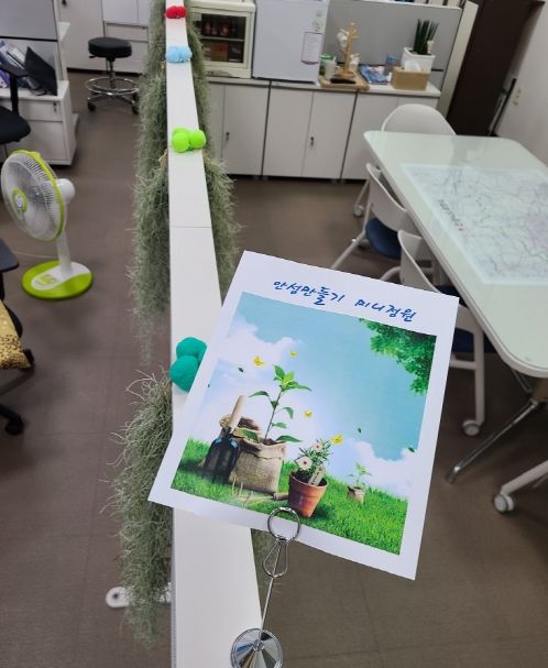 이 행사는 코로나19로 어느 때보다 힘들고 무거웠던 사무실 분위기 조성을 위한 일환으로 실내 미니 정원 만들며 직원들간의 소소한 일상에 찾아보기 힘든 힐링의 시간이었으며, 매일 반복되는 생활속에서 식물과 접할수 있는 좋은 기회였으며, 또한 아름다운 화분을 비치함으로써 사무실에 근무하는 직원들과 민원인분들도 함께 행복하길 바라는 마음으로 시행하고 있다.