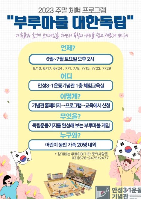 [제주교통복지신문 김강석 기자] 안성3.1운동기념관은 주말을 맞이하여 가족이 함께 즐길 수 있는 체험 교육 프로그램을 실시한다.