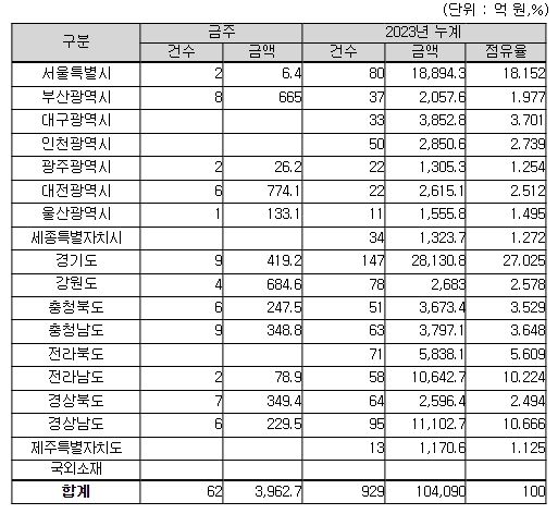 지역별로는 대전광역시 774억 원, 강원도 685억 원, 부산광역시 665억 원, 그 밖의 지역이 1,839억 원이다.