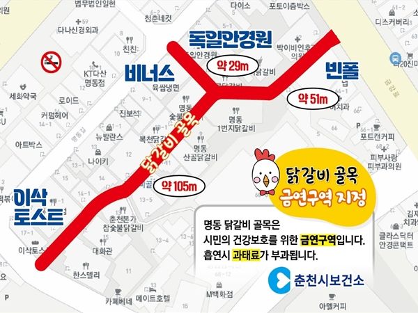 춘천시 보건소에 따르면 ‘춘천시 금연 구역 지정 및 금연 지도원 운영에 관한 조례’ 제4조에 따라 춘천 명동 닭갈비 골목은 31일부터 금연 구역이다.