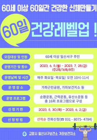 [제주교통복지신문 김강석 기자] 고양특례시 일산서구보건소는 다가오는 6월 5일부터 7월 28일까지 '60일 건강레벨업' 2기를 운영한다.